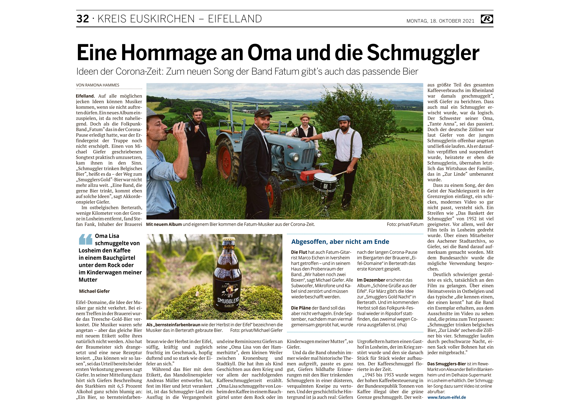 Während der zurückliegenden Monate haben wir die Zeit für die Aufnahme einer neuen Schallplatte genutzt, die voraussichtlich im Dezember erscheinen wird. 12 neue Lieder umfasst die Titelauswahl der klassischen Vinylscheibe mit dem Titel „Schöne Grüße aus der Eifel“. Unter anderem werden wir sechs Lieder der neuen LP bei unserem Konzert im Biergarten der Brauerei „Eifel Domaine“ spielen. Darüber hinaus freuen wir uns bei dieser Gelegenheit das von uns mitkreierte neue Bier „Smugglers Gold“ vorzustellen. Unser Schmugglerlied ist das offizielle Lied des „Smugglers Gold“.