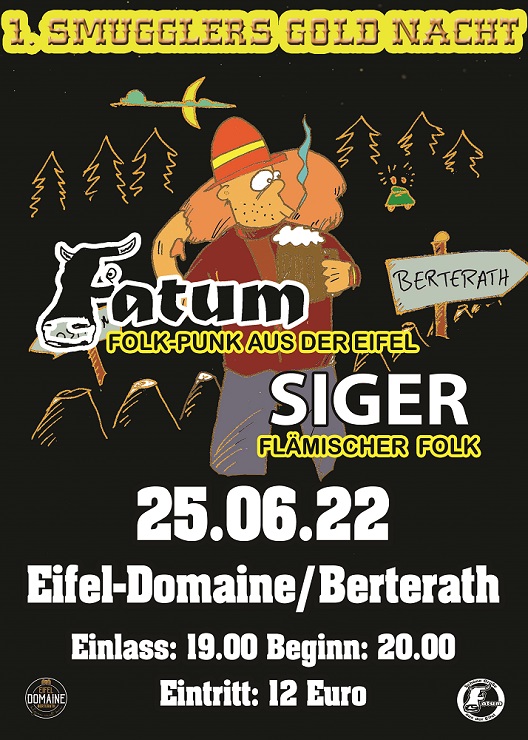 Am 25. Juni 2022 findet ab 19:00 Uhr in der Brauerei „Eifel Domaine“ die „1. Smugglers Gold Nacht“ statt. Die Idee dazu wurde quasi synchron mit dem Smugglers Gold Bier geboren. Gemeinsam mit dem Brauereiinhaber Stefan Fank wollen wir euch einen tollen musikalischen Abend im urigen Ambiente der Brauerei in Berterath bieten. Wir sind froh, dass wir zur Erstauflage die flämische Band „Siger“ als „Vorband“ engagieren konnten. Die beiden Brüder stehen schon seit über 15 Jahren auf der Bühne und haben in vielen Teilen der Welt ihre grandiosen Instrumentalstücke zum Besten gegeben. Diese handgemachte Musik passt wunderbar ins traditionelle Gemäuer der Eifel Domaine. Im Anschluss an Siger werden wir unsere neue Platte „Schöne Grüße aus der Eifel“, voraussichtlich zum ersten Mal, live vorstellen – darauf freuen wir uns jetzt schon riesig!