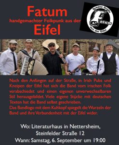 Leider müssen wir das 8. Eifeler Folkpunk-Festival in Ripsdorf, das für Samstag, den 26. September 2020 vorgesehen war, wegen der Covid-19 Pandemie absagen. Wir hoffen, dass wir unser kleines Festival mit internationalen Musikern im nächsten Jahr, am 25. September 2021, wieder im Saal Hammes-Huth in Ripsdorf wie gewohnt ausrichten können.