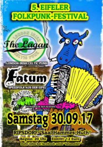 Als Veranstaltungsort und Mitorganisator war Familie Hammes aus Ripsdorf wieder zu begeistern. Daher findet die fünfte Auflage des Eifeler Folkpunk Festivals wieder im Saal der Gaststätte „Hammes-Huth“ am Samstag, den 30. September 2017 ab 20 Uhr im schönen Eifeldorf Ripsdorf statt. Der Eintritt wird 12 € betragen.